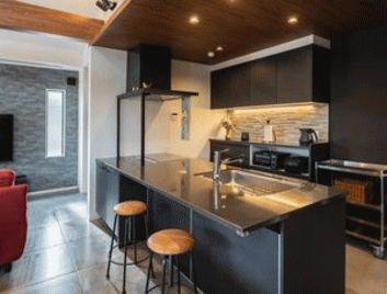 屋内設備 | ◉リビング タイル貼りのリビングには大きなソファと65インチのTVがございます。このTVにPCをHDMIケーブルで接続し、大画面でリモートワークも可能です。リフトアップするテーブルですのでPC操作も快適です。 ◉ダイニング